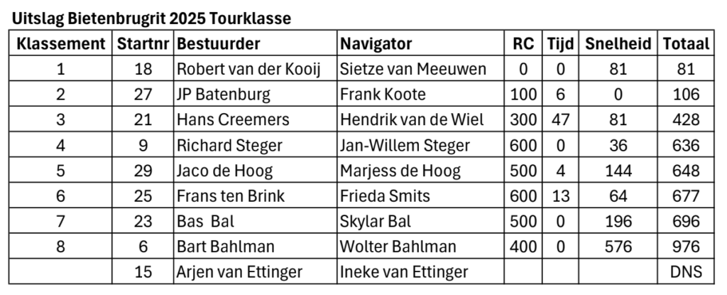 In de Sportklasse is Derek de Leeuw die nog nooit eerder een ritje reed uiteindelijk de beste met zijn navigator Ton Drost. In de Tourklasse imponeren de rookies Robert van der Kooij en Sietze van Meeuwen middels een foutloze rit met alleen wat strafpunten op de snelheidscontrole. Dank aan de uitzetters Fred en Yvonne Hak en onze felicitaties voor de prijswinnaars.”