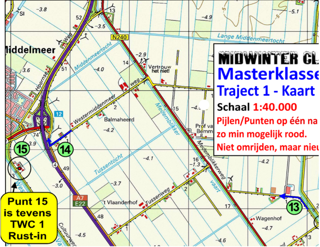 Sowieso goed opletten en omschakelen, want in de middag rijden we met pijlen en punten gecombineerd (dus de kleur bepaalt wat je moet doen: blauw = kortste route, rood = één-na-kortste route, groen = vrije route). Anders dan in de ochtend is het nu ook een kwestie van je route goed intekenen en deze zo nauwkeurig mogelijk rijden. En als deze niet te rijden is: geen nieuwe route maken, maar de voorgenomen route weer oppakken. Pff… Bent u er nog?