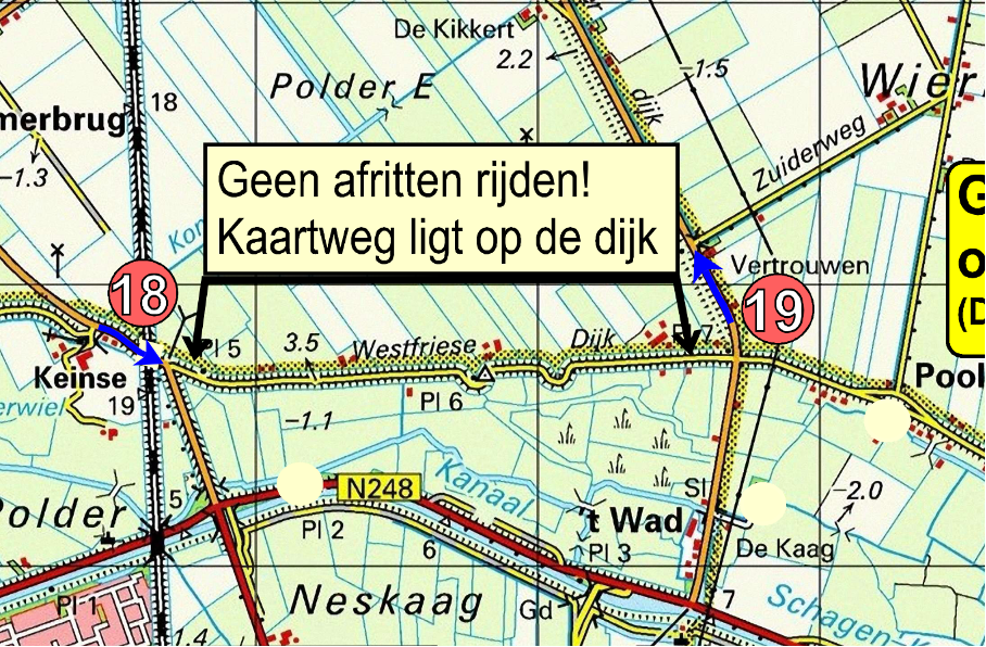 Het eerste voorbeeld: de route van pijl 18 naar pijl 19. De lok-cirkel is inmiddels algemeen bekend, maar door deze (simpele) afleiding ging ik toch bijna de fout in. Je wordt namelijk uitgenodigd door het tekstblok om over de dijk te rijden.
