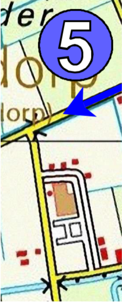 Dan, in mijn beleving, de mooiste grap van de rally: de één-na-kortste route naar pijl 6. We mogen wegen in beide richtingen gebruiken, dus na pijl 5 linksaf, direct weer links de witte weg op, het keerlusje draaien en terug naar pijl 5. Maar als je goed kijkt zie je dat er twee witte wegen parallel naar het lusje lopen. En als je héél goed kijkt, zie je dat de weg vanuit het noorden niet naar het keerlusje leidt, maar doodloopt.